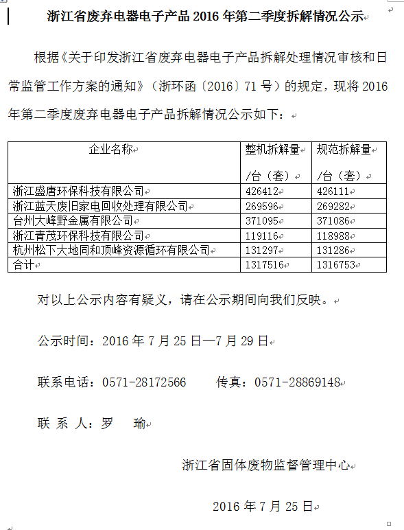 浙江2016年第2季度废弃电器电子产品拆解情况公示
