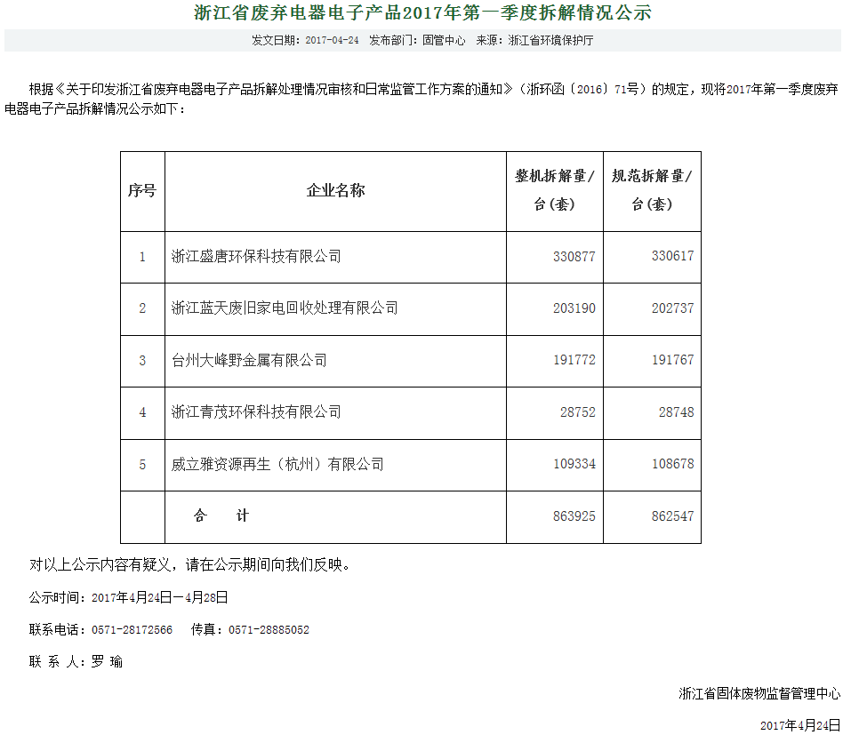 浙江省2017年第1季度废弃电器电子产品处理公示