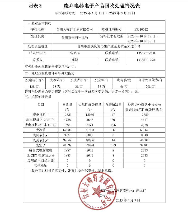2025年第1季度回收处理公示